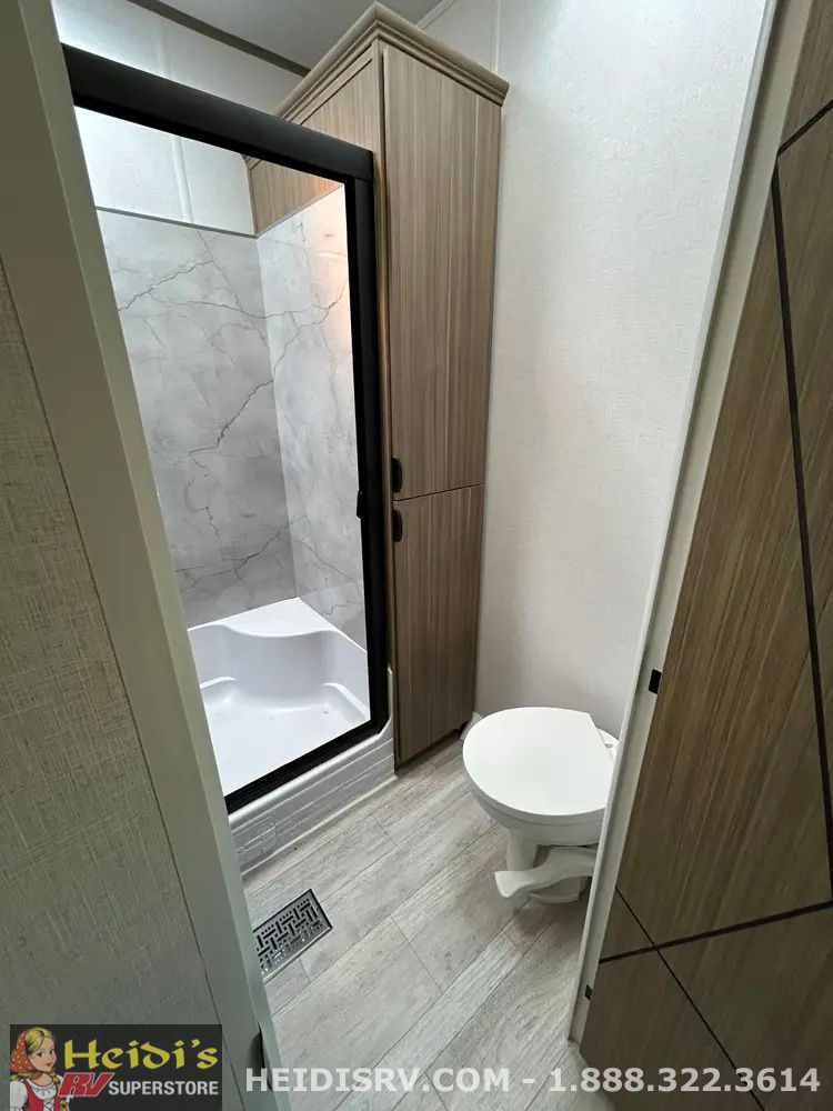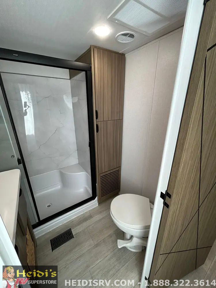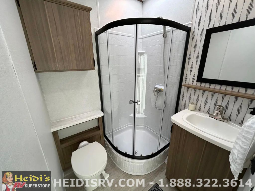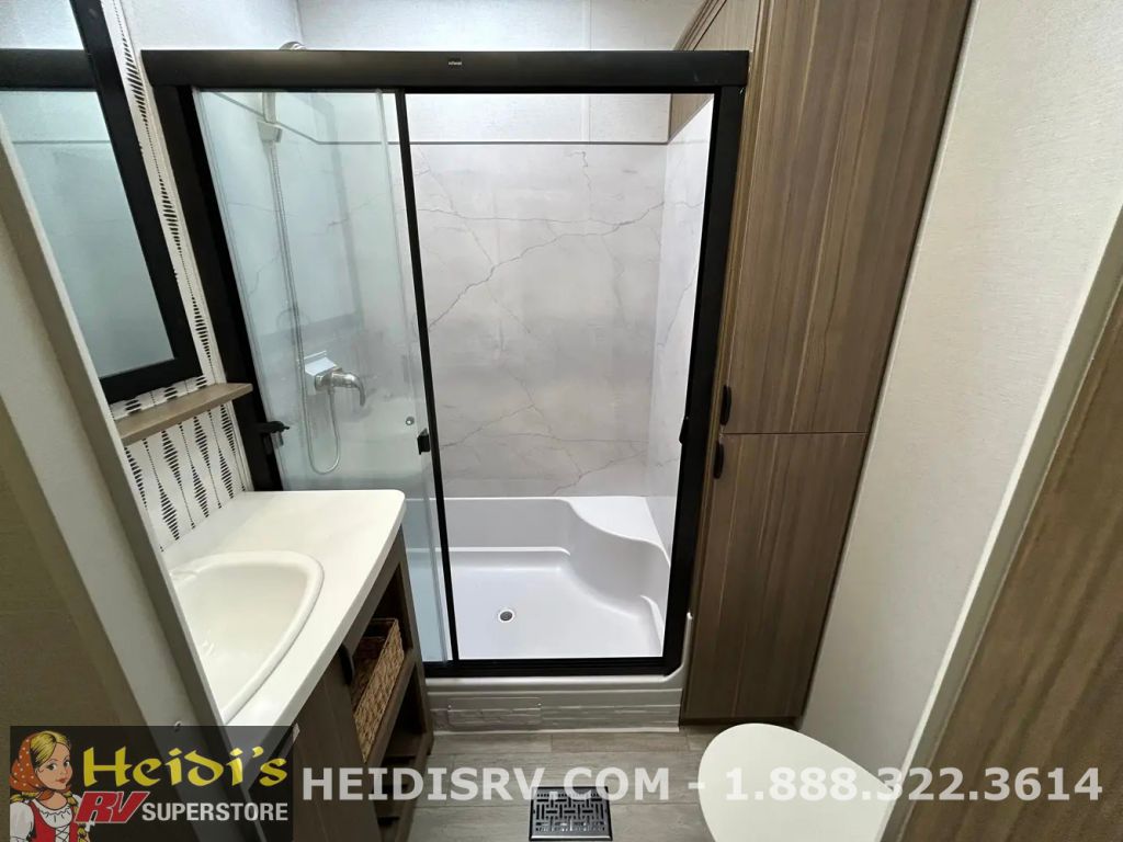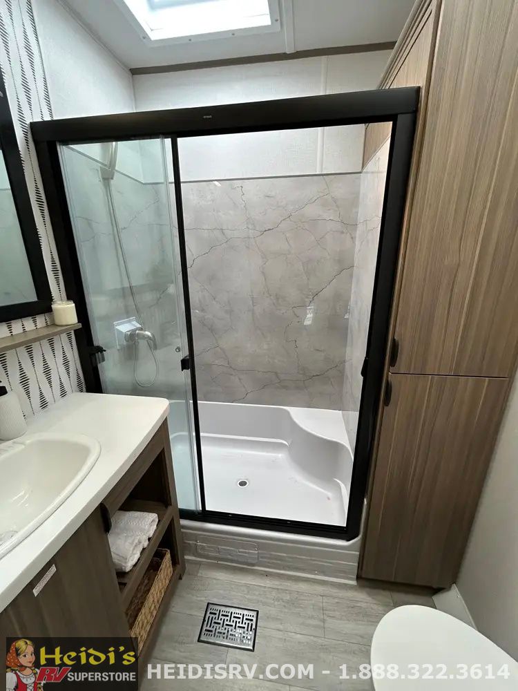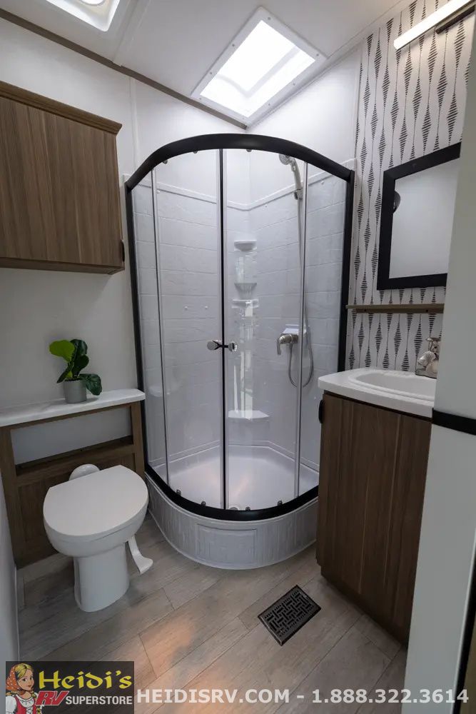 Your king-size bedroom comes with tons of storage and washer/dryer hookups, because packing 14 hoodies "just in case" isn’t the move. The bathroom? Think walk-in shower, built-in seat, skylight, and actual linen storage—because yes, you can have nice things at the campground.