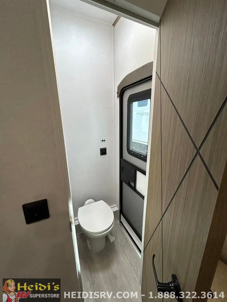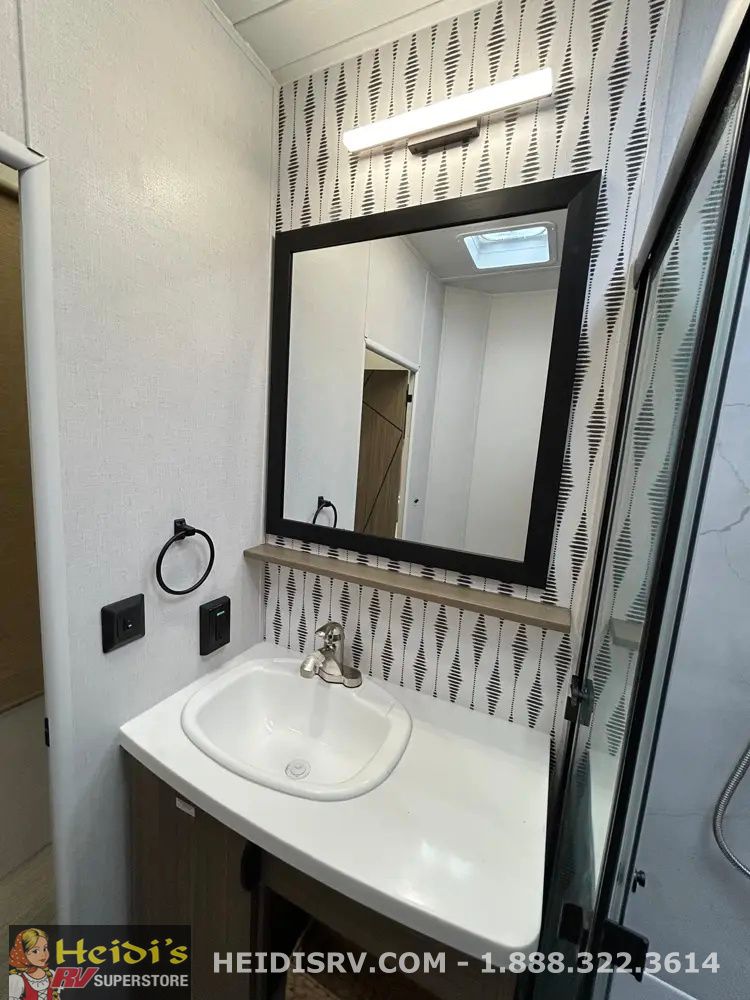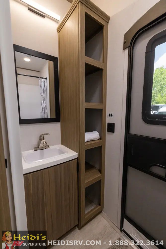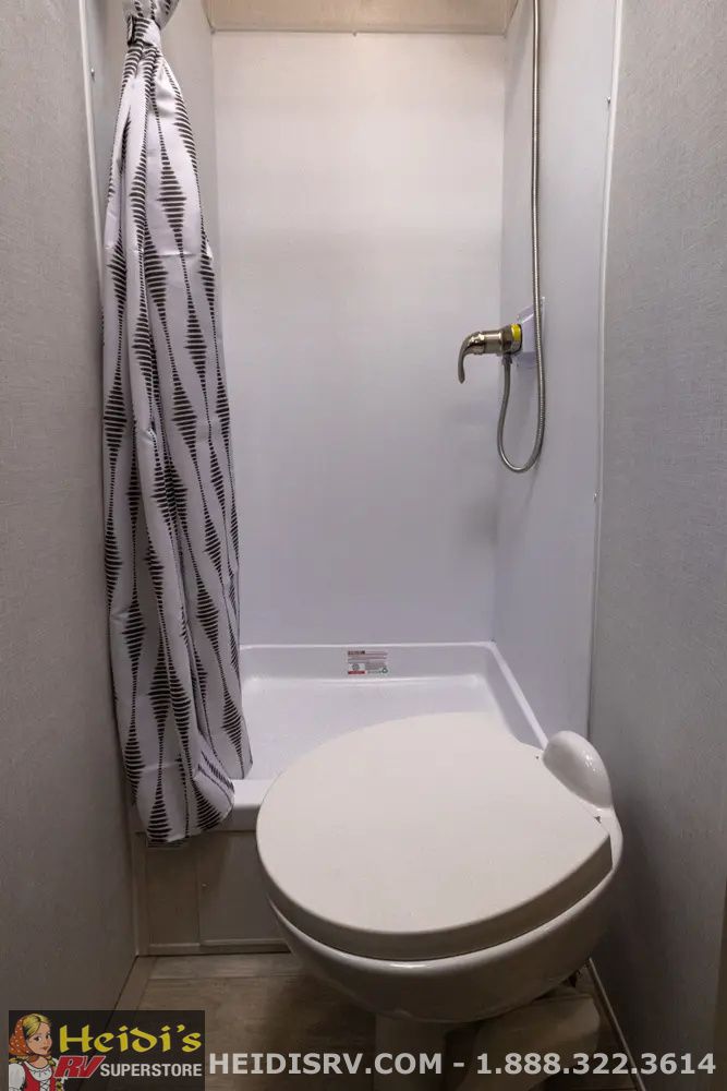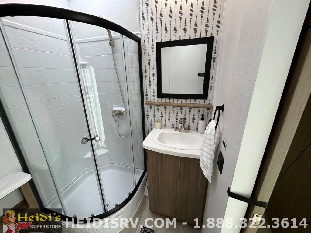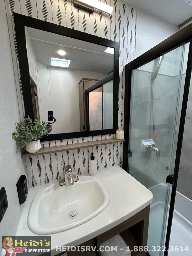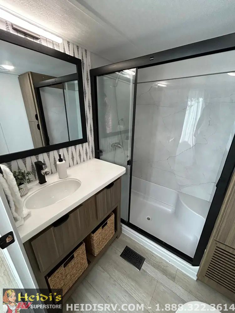 Your king-size bedroom comes with tons of storage and washer/dryer hookups, because packing 14 hoodies "just in case" isn’t the move. The bathroom? Think walk-in shower, built-in seat, skylight, and actual linen storage—because yes, you can have nice things at the campground.