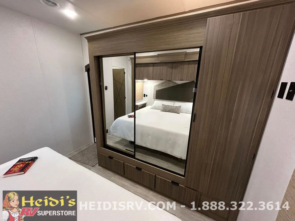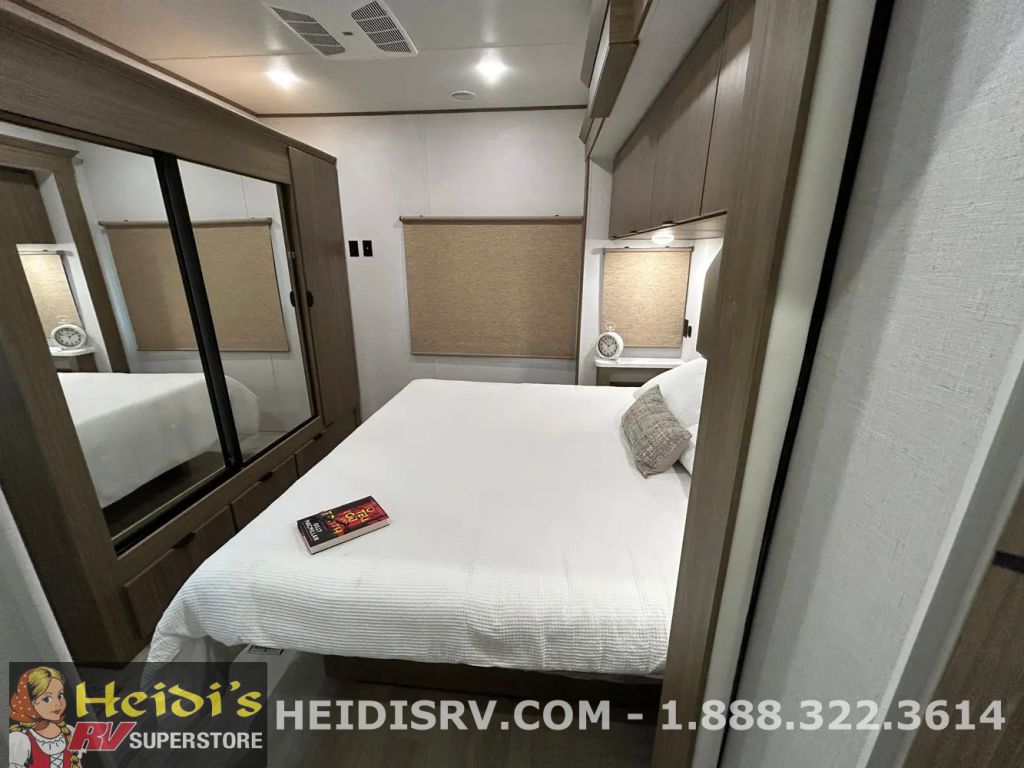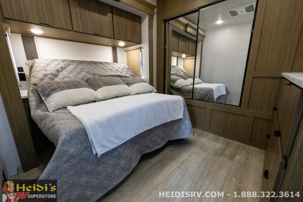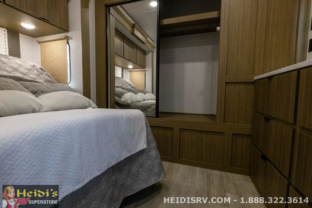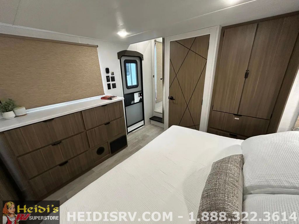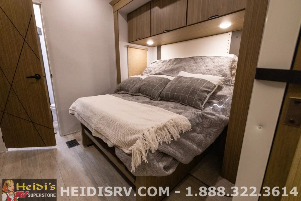 As the night draws in, the spacious bathroom with its large shower and linen storage offers the perfect refresh after a day of outdoor fun. Tucked away in the master bedroom, you’ll find a luxurious Versa-Tilt custom king bed, surrounded by ample wardrobe and dresser space. You wake up feeling rested, ready for another day of adventure.