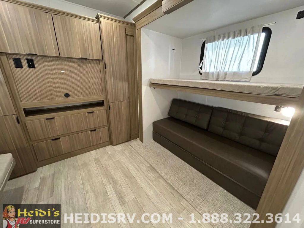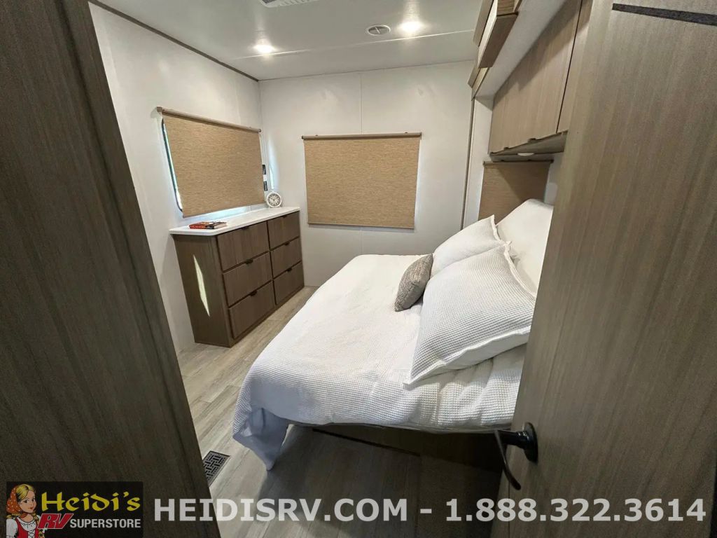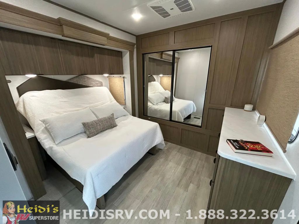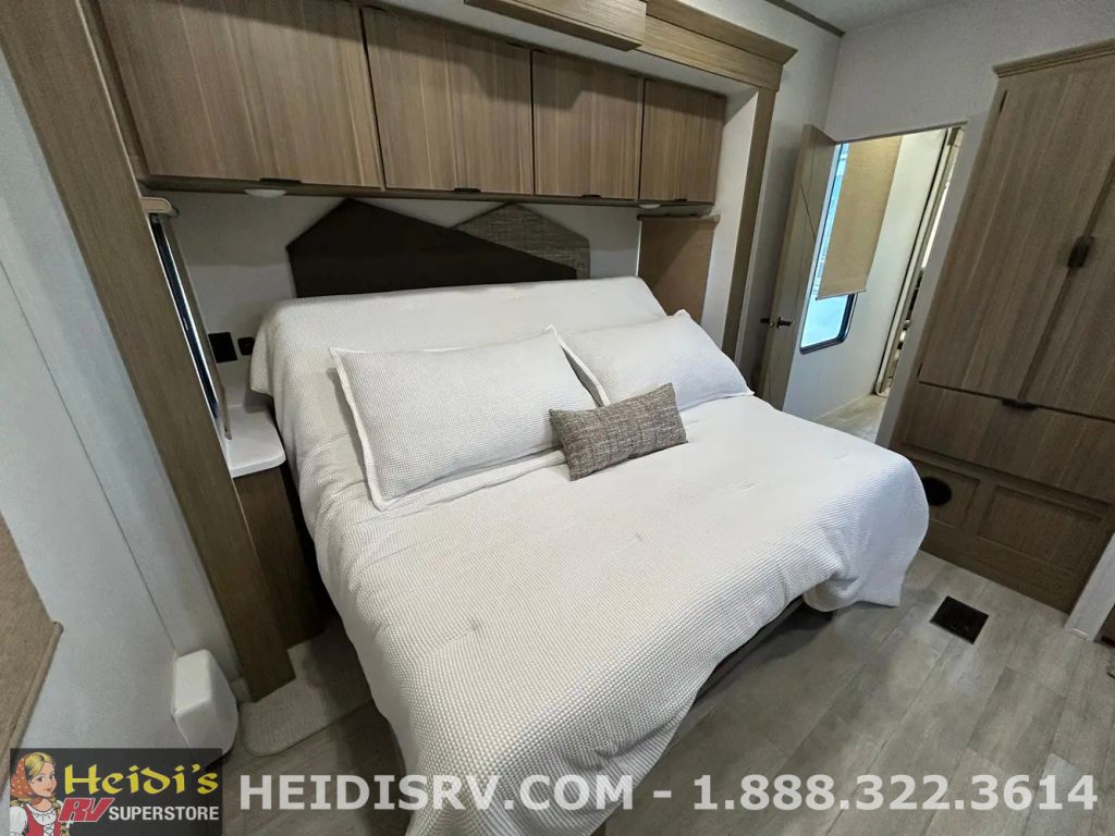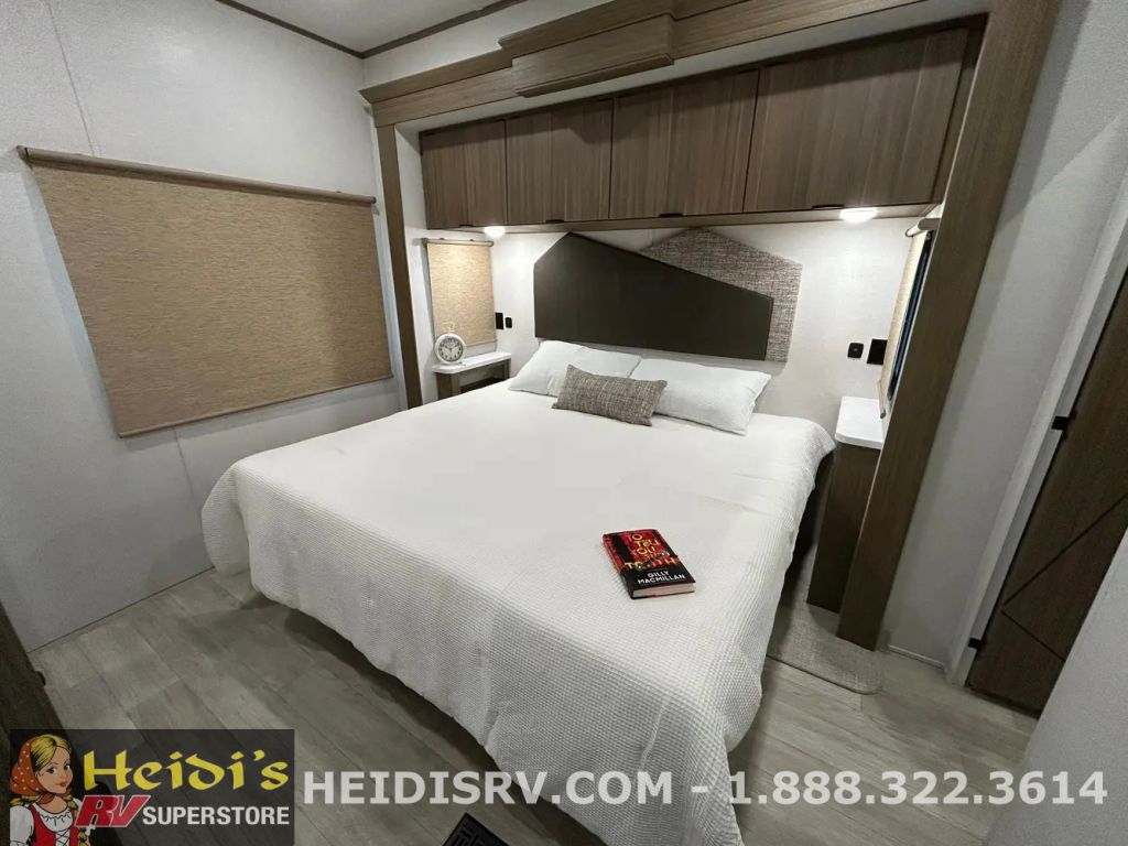 As the night draws in, the spacious bathroom with its large shower and linen storage offers the perfect refresh after a day of outdoor fun. Tucked away in the master bedroom, you’ll find a luxurious Versa-Tilt custom king bed, surrounded by ample wardrobe and dresser space. You wake up feeling rested, ready for another day of adventure.