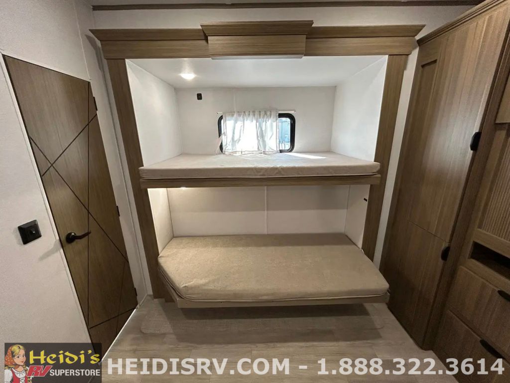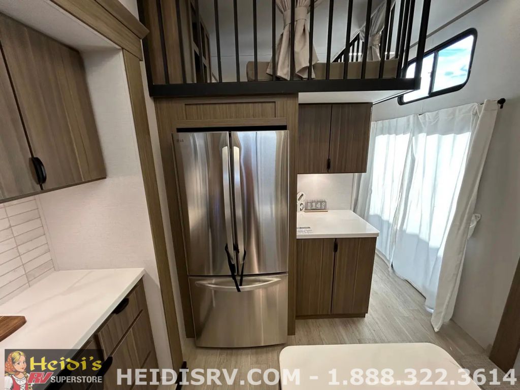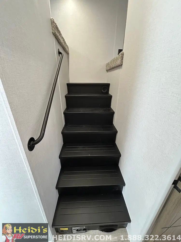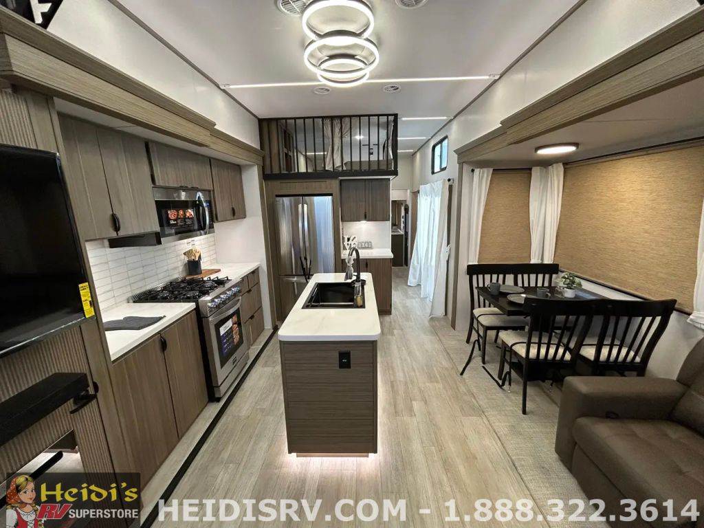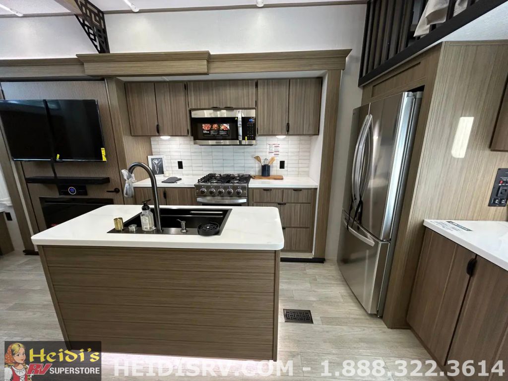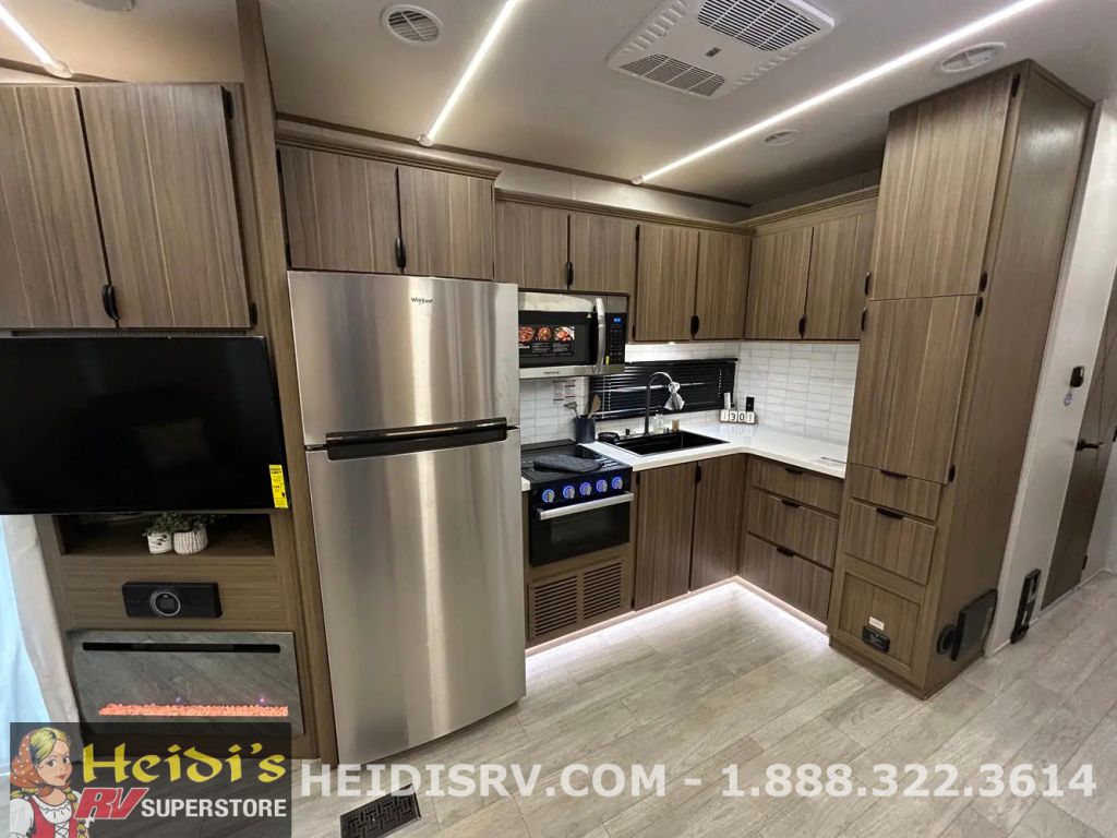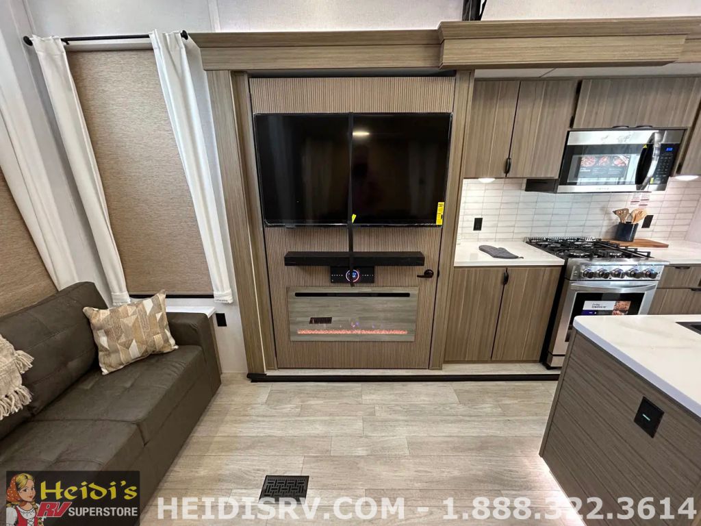 You will feel like you are home when you step inside! Not only will you be impressed with the super large slide in the main combined kitchen and living area, but check out the island with five counter height seats! The main entry closest to the front features a step up to a private bedroom featuring a custom king bed with Versa-Tilt within a slide, plus a fireplace, wardrobe, and drawers for your belongings. Just outside this door, a half bath around the corner and a spiral staircase to the front loft with two 42" x 74" bunk mats above. The kitchen is fully equipped for you to provide the best home cooked meals with a roll-out pantry, range and microwave, plus side-by-side refrigerator all part of the large slide that also houses an L-shaped sectional sofa with ottoman so everyone can have a seat! Opposite the sectional find an entertainment center with pop-up TV and fireplace. A second set of stairs leads up to the rear loft featuring a 62" x 74" Versa Queen mattress and dresser. Back down in the very back of the unit a large bathroom with walk-in shower, linen cabinet, toilet, and vanity with sink. There is also a space that has washer/dryer prep to add even more convenience. Outside, a 26' awning for outdoor living, and double entry doors to make it easy to move in and out.