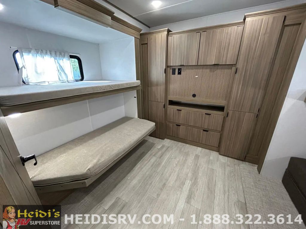 You arrive at the campsite, greeted by the ultimate bunkhouse on wheels with four spacious slides. While the kids explore their own bunk room, complete with three bunks and the versatile Versa-Queen (perfect for lounging, extra sleep space, or a cozy queen bed), you fire up the outdoor kitchen, enjoying the fresh air while prepping dinner.